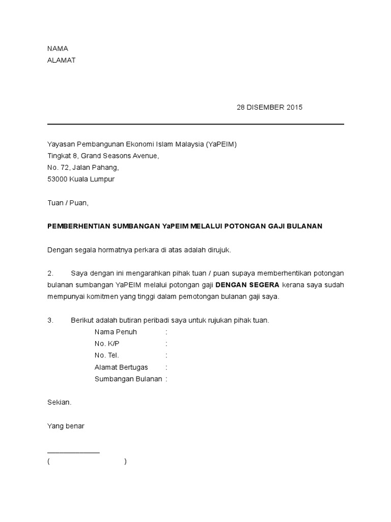 Rentetan isu skandal yapeim oleh jamil khir ramai meminta kami kongsikan format atau cara berhentikan sumbangan kepada yapiem. Contoh surat pemberhentian kerja pemutusan hubungan kerja phk. Berikut adalah butiran peribadi saya untuk rujukan pihak tuanpuan.